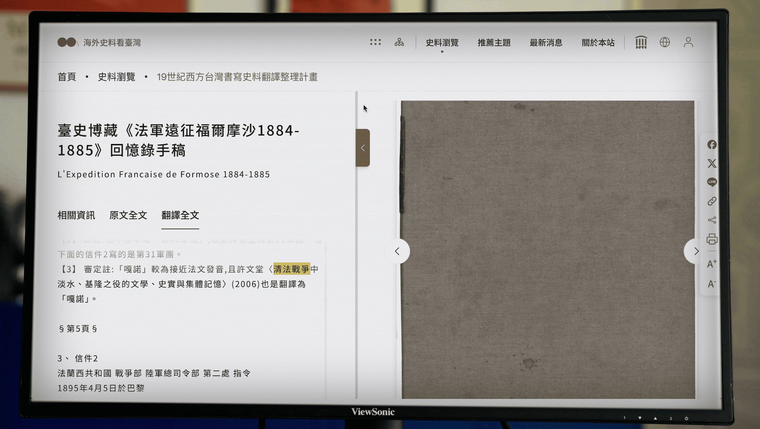 《1884-1885年法國人遠征福爾摩沙》回憶錄手稿在資料庫內供閱覽與全文查詢