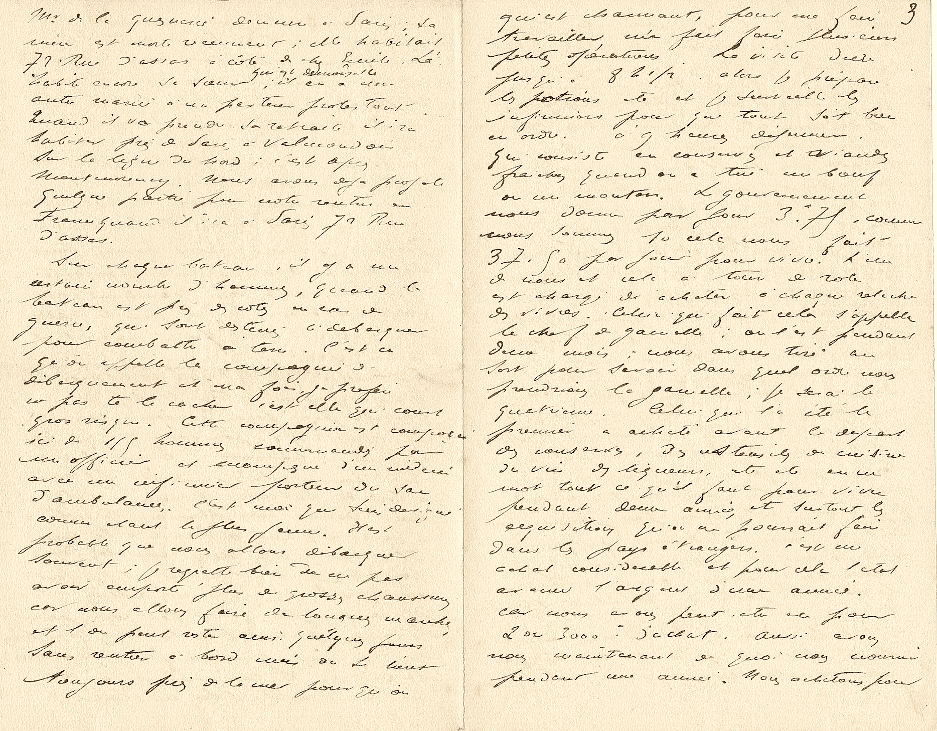 Il y a le matin, à sept heures et demie, ce qu’on appelle la visite quotidienne : c’est le médecin-major qui la fait et qui donne les prescriptions. Le médecin-major, qui est charmant, pour me faire travailler, m’a fait faire plusieurs petites opérations. La visite dure jusqu’à huit heures et demie ; alors je prépare les potions, etc., et je surveille les infirmiers pour que tout soit bien en ordre. À neuf heures, le déjeuner, qui consiste en conserves et viandes fraîches, quand on a tué un bœuf ou un mouton. Le Gouvernement nous donne par jour trois francs soixante-quinze ; comme nous sommes dix, cela nous fait trente-sept francs cinquante par jour pour vivre. L’un de nous, et cela à tour de rôle, est chargé d’acheter, à chaque relâche, des vivres. Celui qui fait cela s’appelle le chef de gamelle ; on l’est pendant deux mois. Nous avons tiré au sort pour savoir dans quel ordre nous prendrions la gamelle ; je serai le quatrième. Celui qui l’a été le premier a acheté, avant le départ, des conserves, des ustensiles de cuisine, du vin, des liqueurs, etc., etc. En un mot, tout ce qu’il faut pour vivre pendant deux années, et surtout les acquisitions qu’on ne pourrait faire dans les pays étrangers. C’est un achat considérable, et pour cela l’État avance l’argent d’une année, car nous avons peut-être ce jour deux ou trois mille francs d’achats. Ainsi avons-nous maintenant de quoi nous nourrir pendant une année. Nous achetons, pour notre santé et notre bien-être, des poulets, des moutons, des fruits variés, dans toutes les relâches où nous passons. Telle est la façon dont se nourrissent les officiers à bord des bateaux de guerre.