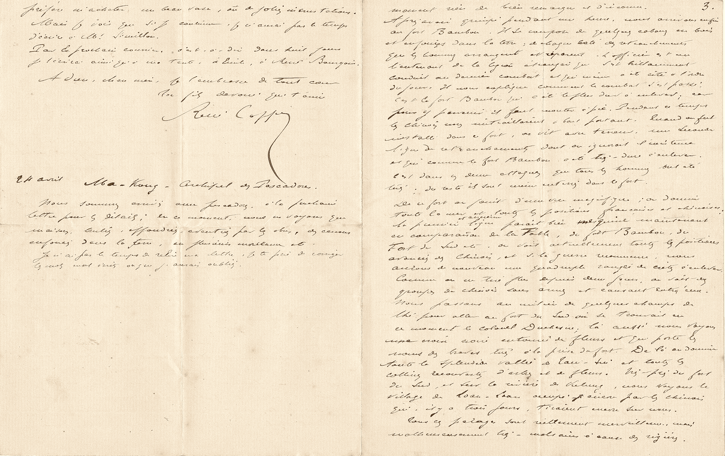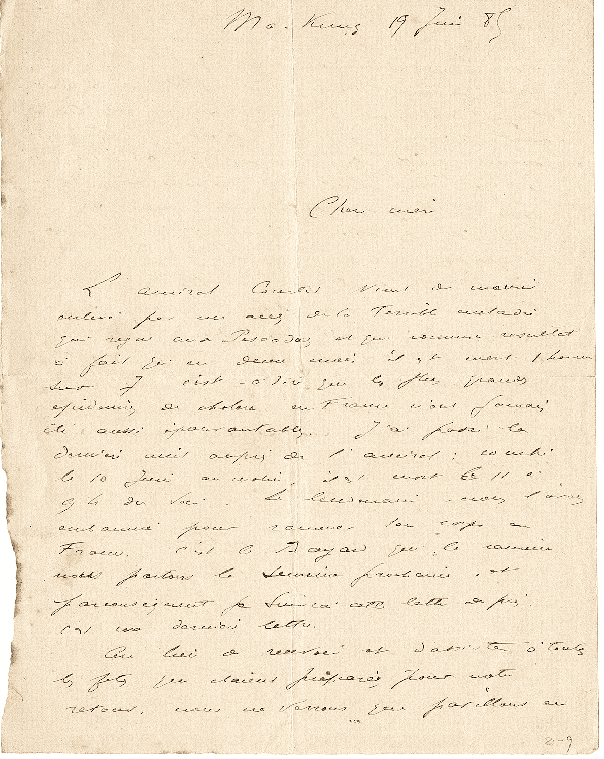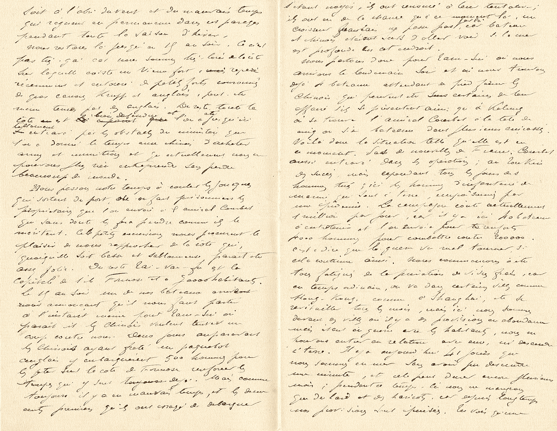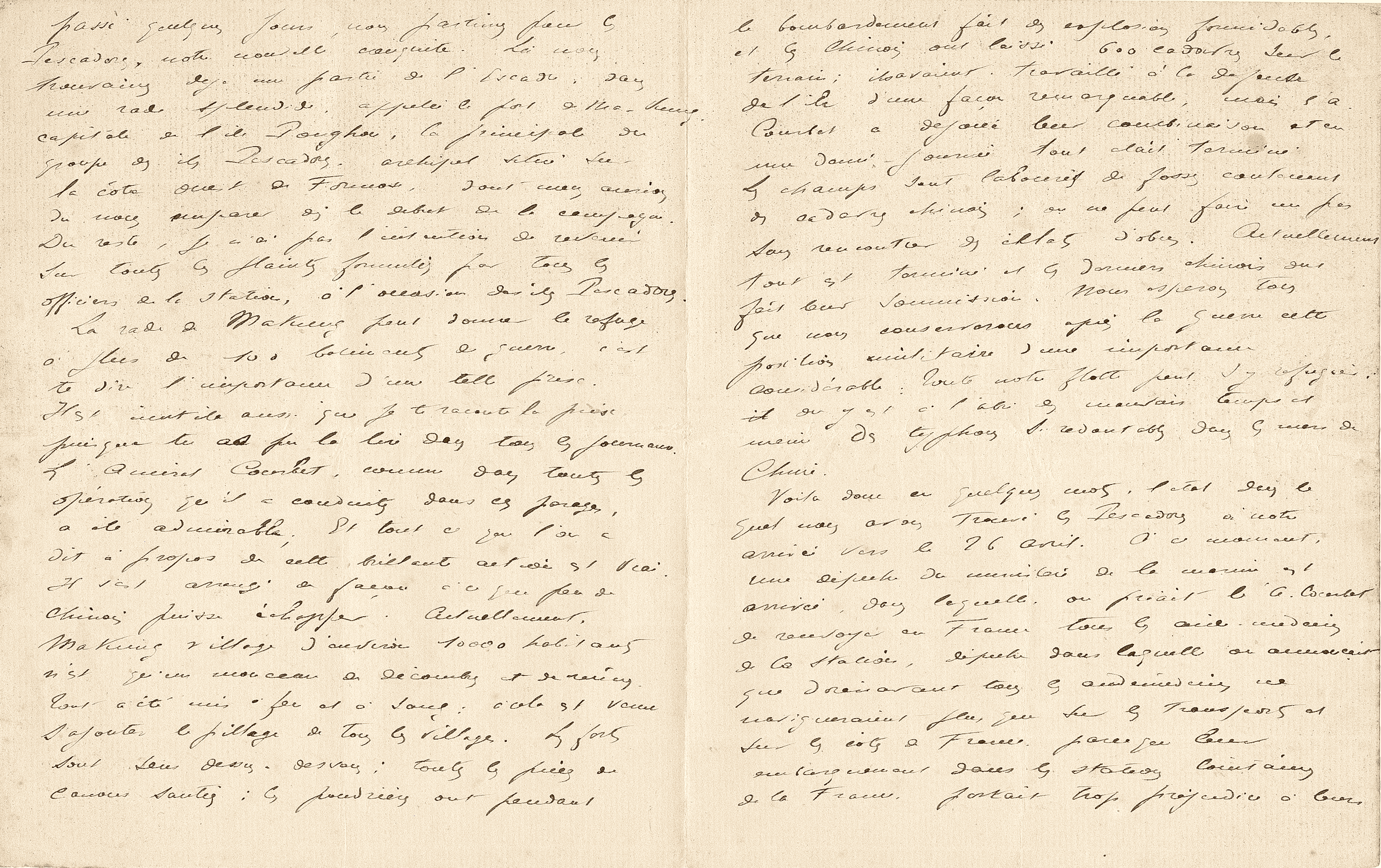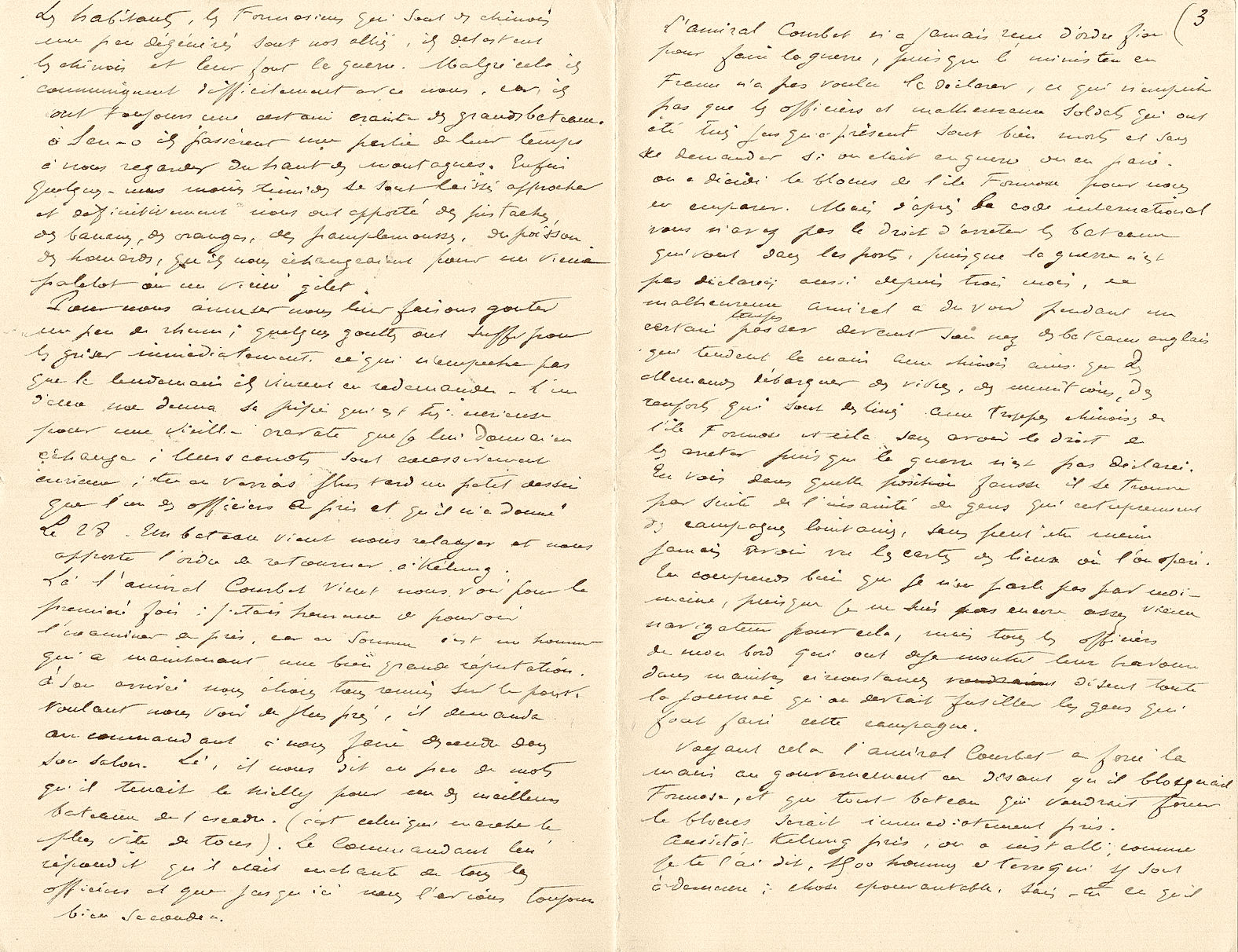 L’amiral Courbet vient de mourir, enlevé par un accès de la terrible maladie qui règne aux Pescadores, et qui comme résultat, a fait qu’en deux mois il est mort 1 homme sur 7, c’est-à-dire que les plus grandes épidémies de choléra en France n’ont jamais été aussi épouvantables. J’ai passé la dernière nuit auprès de l’amiral ; couché le 10 juin au matin, il est mort le 11 à 9 heures du soir. Le lendemain, nous l’avons embaumé pour ramener son corps en France. C’est le Bayard qui le ramène, nous partons la semaine prochaine, et par conséquent je suivrai cette lettre de près. C’est ma dernière lettre.