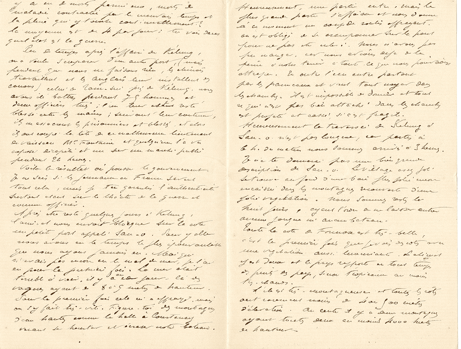 Peu de temps après l’affaire de Kélung, on a voulu s’emparer d’un autre port — mais pendant que nous ne faisons rien, les Chinois travaillent, et les Anglais leur installent des canons — celui de Tam-sui, près de Kélung. Nous avons été battus, perdant soixante-quinze hommes et deux officiers tués ; l’un d’eux est resté blessé entre leurs mains. Suivant leur coutume, ils massacrent les prisonniers et les blessés ; ils ont alors coupé la tête de ce malheureux lieutenant de vaisseau, M. Fontaine, et quelqu’un l’a vue exposée, décapitée et mise sur un marché public pendant vingt-quatre heures. Voilà le résultat où pousse le Gouvernement. Je ne sais si les journaux en France savent tout cela, mais je t’en garantis l’authenticité, surtout étant sur le théâtre de la guerre et comme officier.