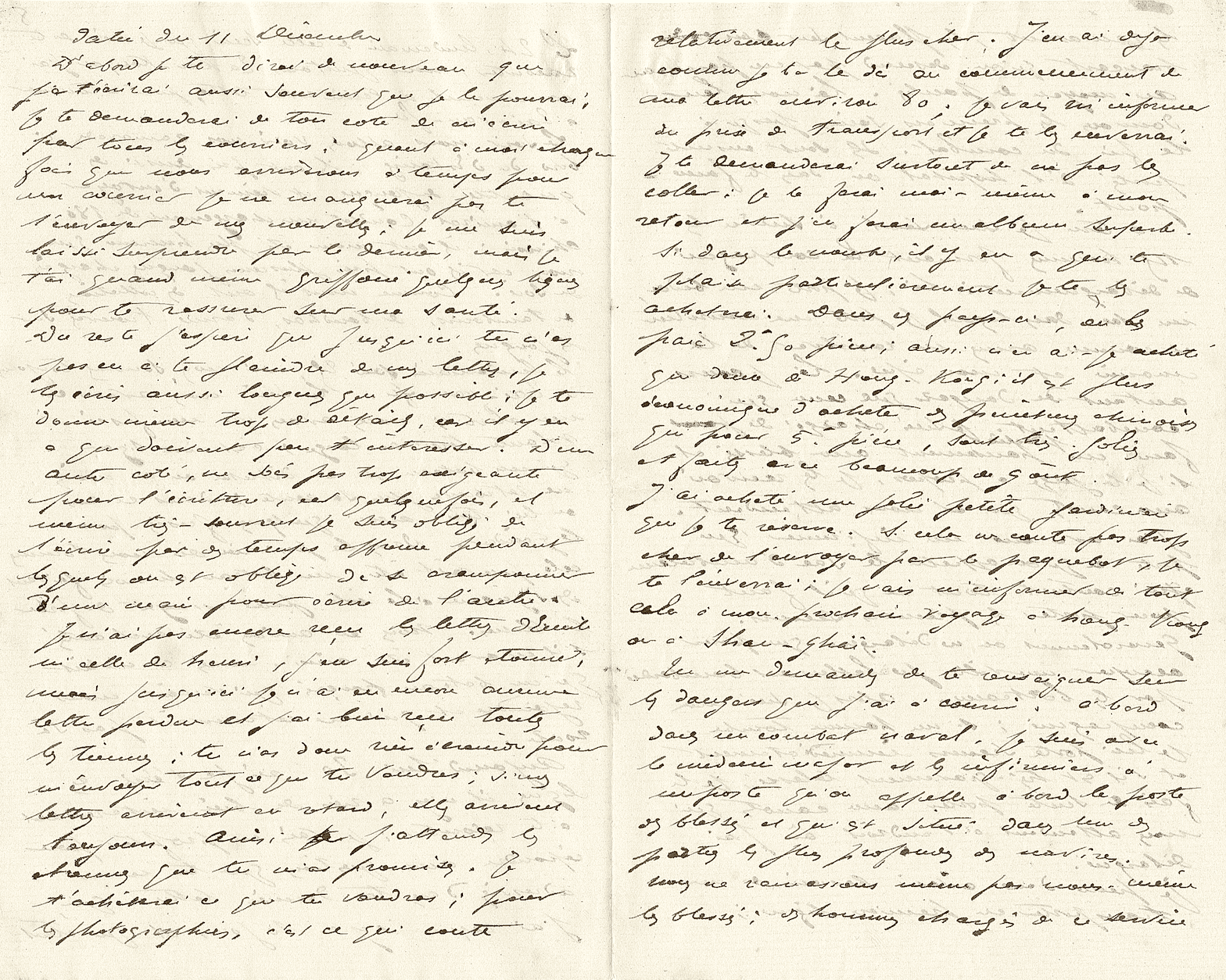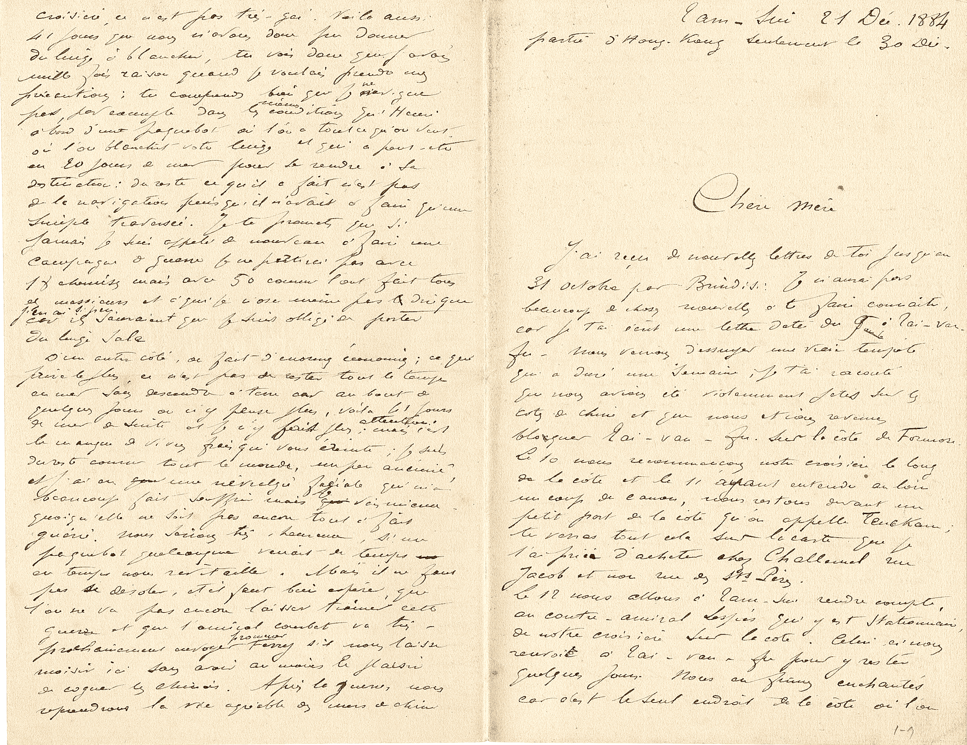 Inutile que je te fasse l’éloge de l’amiral C., il est trop connu pour rappeler ses services. Ici, c’était un Dieu. Les équipages avaient une telle confiance en lui, qu’il les aurait conduits au bout du monde. Du reste, je t’en parlerai plus longuement puisque je viens de passer six semaines auprès de lui et que je commençais à le connaître. Quant à mes impressions de voyage, je te les raconterai en détails.