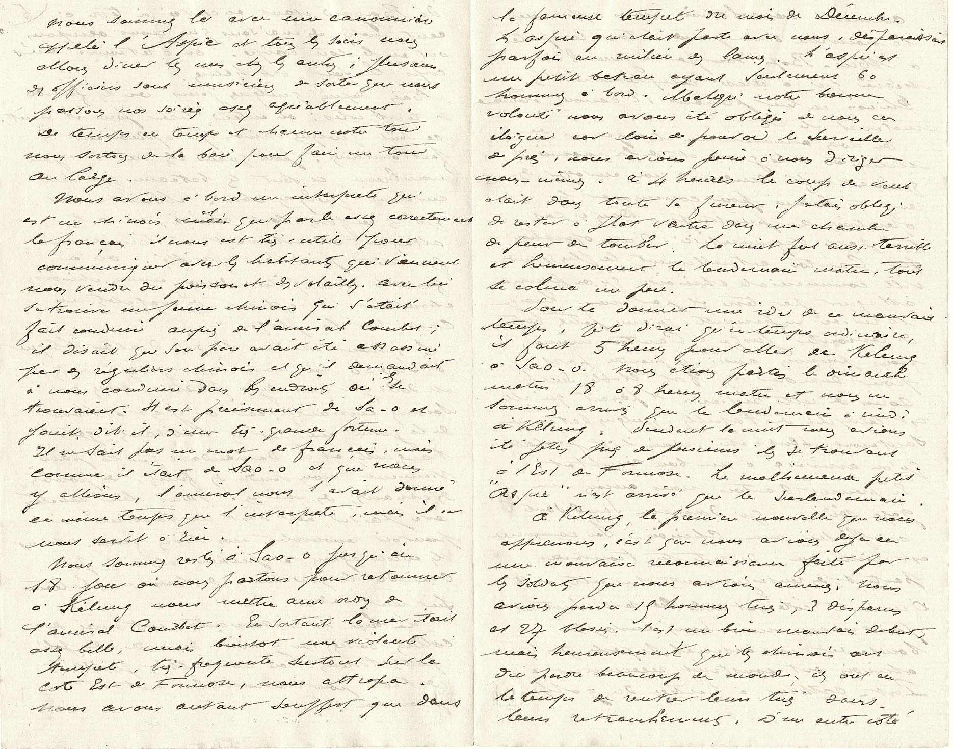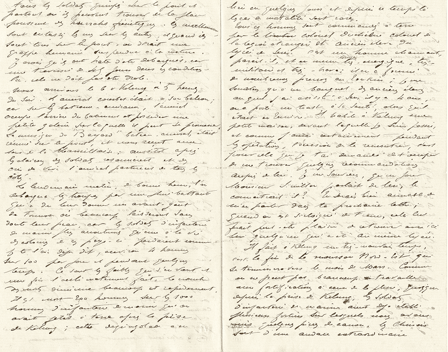 Aussitôt Kélung pris, on a installé, comme je te l’ai dit, quinze cents hommes à terre, qui y sont à demeure. Chose épouvantable, sais-tu ce qu’il y a eu de morts parmi eux, morts de maladies contractées par le mauvais temps et la pluie qui y tombe continuellement ? La moyenne est de quatre par jour ; tu vois dans quel état est la guerre.