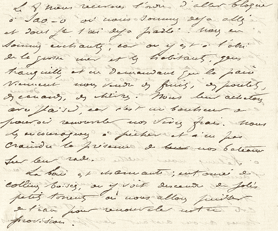 Le 8, nous recevons l’ordre d’aller bloquer à Sao-o où nous sommes déjà allés et dont je t’ai déjà parlé. Nous en sommes enchantés, car on y est à l’abri de la grosse mer et les habitants, gens tranquilles et ne demandant que la paix, viennent nous vendre des fruits, des poulets, des canards, des chèvres. Nous leur achetons avec plaisir, car c’est un bonheur de pouvoir renouveler nos vivres frais. Nous les encourageons à pêcher et à ne pas craindre la présence de nos bateaux sur leur rade. La baie est charmante ; entourée de collines boisées, on y voit descendre de jolis petits torrents où nous allons puisser de l’eau pour renouveler notre provision.