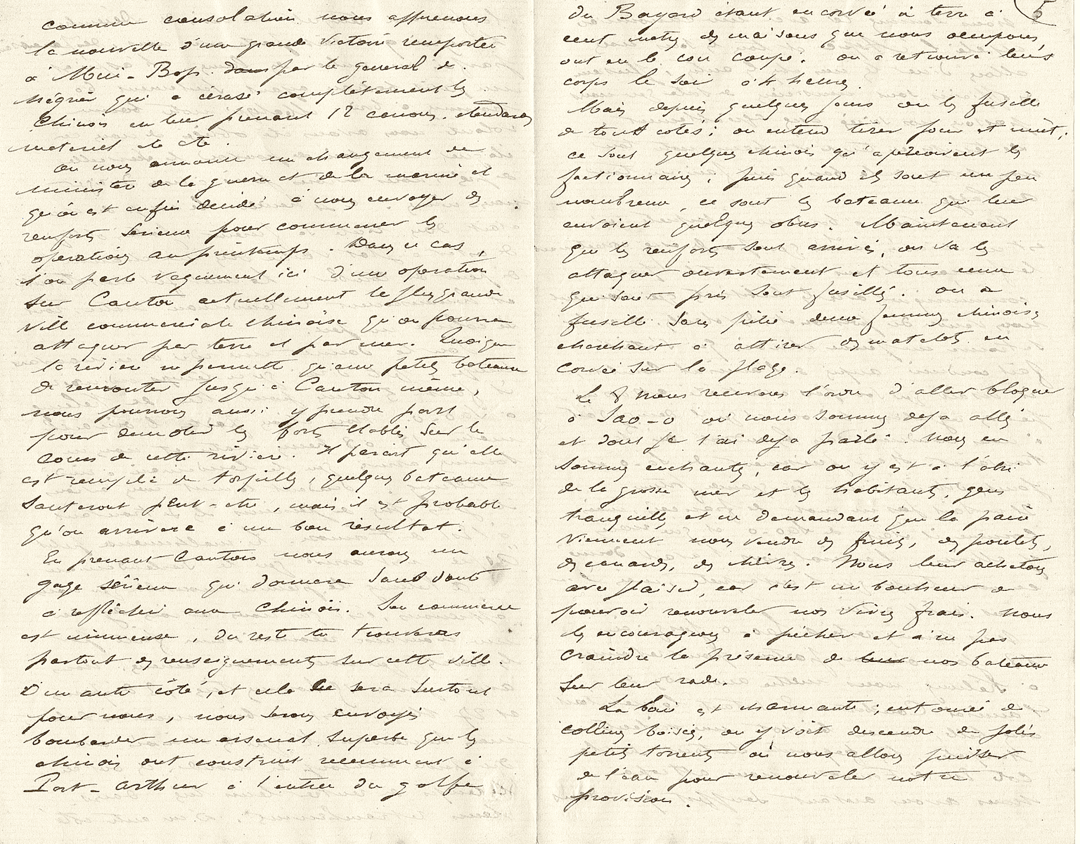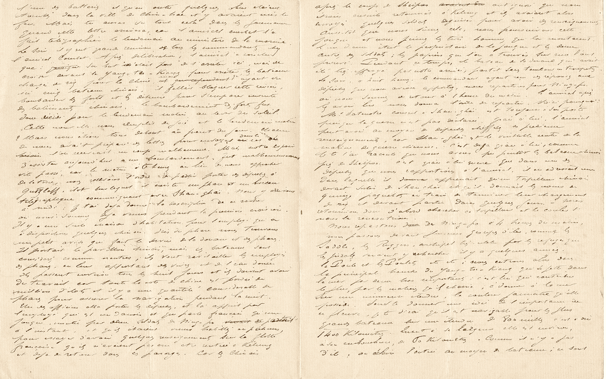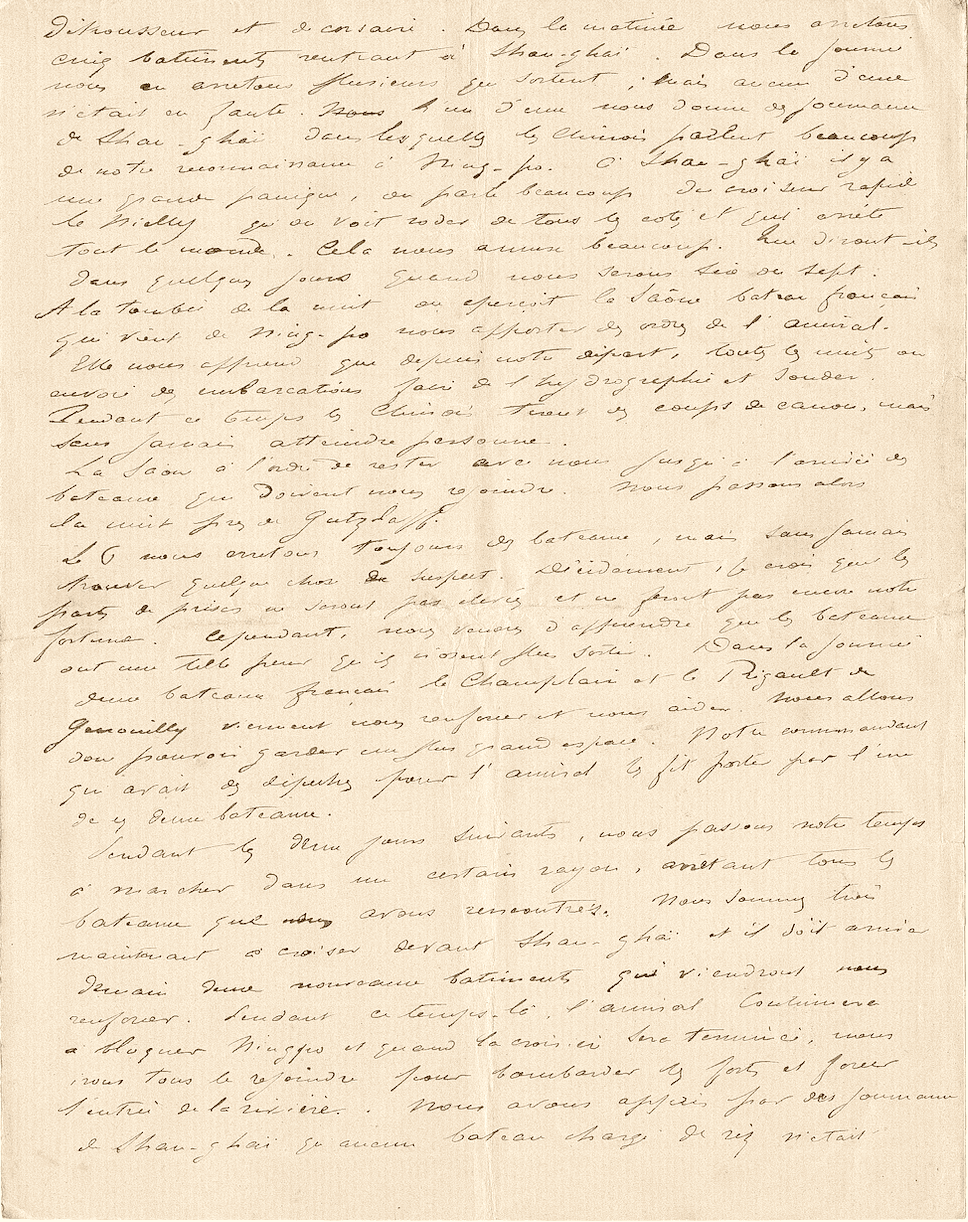 之後兩天的時間,我們都在一定範圍內航行,並攔截所有遇到的船隻。Nielly艦目前在上海前巡航,明天應該會有2艘船艦再過來增援。這段期間元帥將繼續封鎖寧波,巡航結束之後,我們將與他會合並一同轟炸堡壘、突破河口的封鎖。我軍從上海的一些報紙上得知目前還沒有任何運載稻米的船隻駛離,而且原本負責的艦長堅決拒絕出航,因為不想在海灣口或河口被法國巡洋艦攔截。