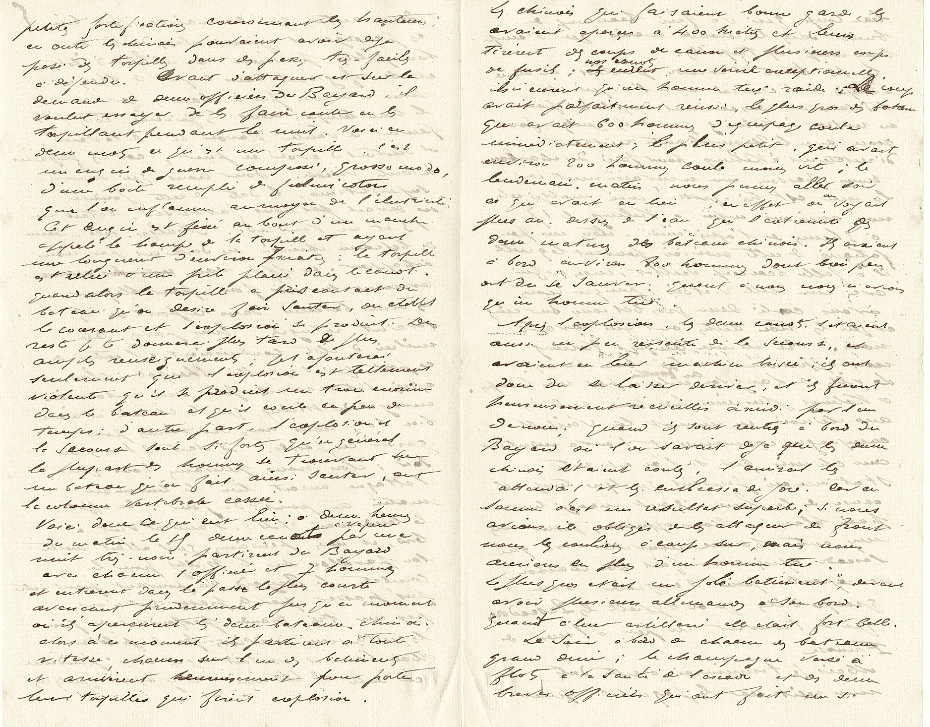 Voici donc ce qui eut lieu : à deux heures du matin, le 15, deux canots à vapeur, par une nuit très noire, partirent du Bayard avec chacun un officier et sept hommes, et entrèrent dans la passe la plus courte, avançant prudemment jusqu’au moment où ils aperçurent les deux bateaux chinois. À cet instant, ils partirent à toute vitesse, chacun sur l’un des bâtiments, et arrivèrent heureusement à porter leurs torpilles, qui firent explosion. Les Chinois, qui faisaient bonne garde, les avaient aperçus à quatre cents mètres et leur tirèrent des coups de canon et plusieurs coups de fusil. Nos canots eurent une veine exceptionnelle : ils n’eurent qu’un homme tué raide. Le coup avait parfaitement réussi ; le plus gros des bateaux, qui avait six cents hommes d’équipage, coula immédiatement ; le plus petit, qui en avait environ deux cents, coula moins vite.