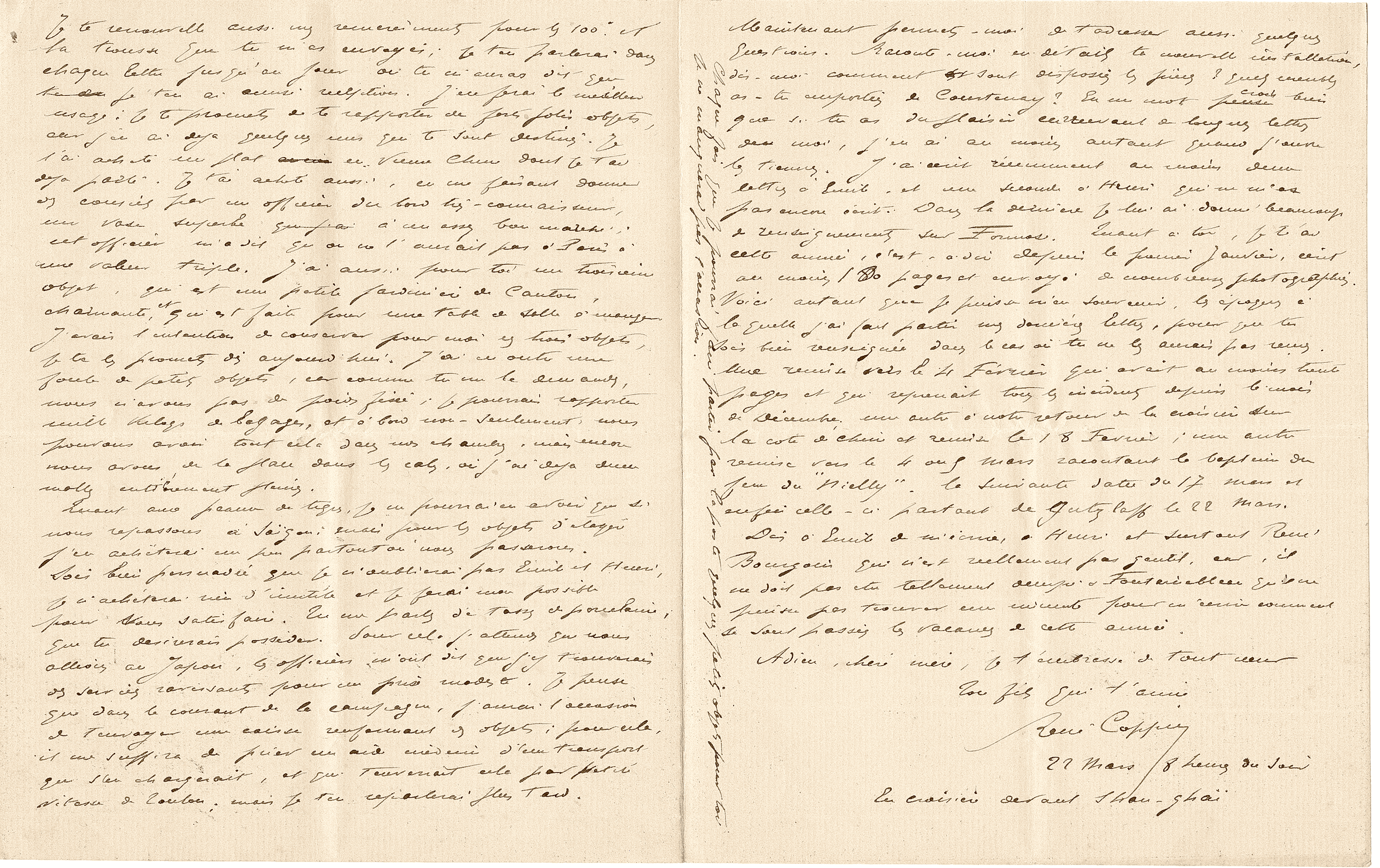 Je te renouvelle aussi mes remerciements pour les 100 F et la trousse que tu m’as envoyés ; je t’en parlerai dans chaque lettre jusqu’au jour où tu m’auras dit que je t’en ai accusé réception. J’en ferai le meilleur usage. Je te promets de te rapporter de forts jolis objets, car j’en ai déjà quelques-uns qui te sont destinés. Je t’ai acheté un plat en vieux chine dont je t’ai déjà parlé. Je t’ai acheté aussi, en me faisant donner des conseils par un officier du bord très connaisseur, un vase superbe à un assez bon marché. Cet officier m’a dit qu’on ne l’aurait pas à Paris à une valeur triple. J’ai aussi pour toi un troisième objet, qui est une petite jardinière de Canton, charmante et qui est faite pour une table de salle à manger. J’avais l’intention de conserver pour moi ces trois objets, je te les promets dès aujourd’hui. J’ai en outre une foule de petits objets, car comme tu me le demandes, nous n’avons pas de poids fixé. Je pourrais rapporter mille kilogs de bagages, et à bord, non seulement nous pouvons avoir tout cela dans nos chambres, mais encore nous avons de la place dans les cales, où j’ai déjà deux malles entièrement pleines. Quant aux peaux de tigres, je ne pourrai en avoir que si nous repassons à Saïgon ; mais les objets d’étagère, j’en achèterai un peu partout où nous passerons.