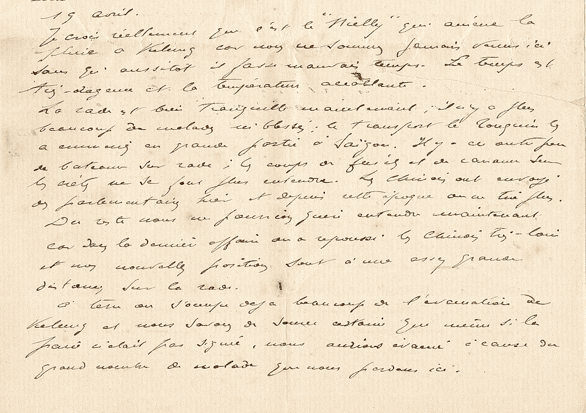 Je crois réellement que c’est le Nielly qui amène la pluie à Kélung, car nous ne sommes jamais venus ici sans qu’aussitôt il fasse mauvais temps. Le temps est très orageux et la température accablante. La rade est bien tranquille maintenant ; il n’y a plus beaucoup de malades ni blessés, le transport le Tonkin les a emmenés en grande partie à Saïgon. Il y a en outre peu de bateaux sur rade ; les coups de fusils et de canaux sur les crêtes ne se font plus entendre. Les Chinois ont envoyé des parlementaires hier et depuis cette époque on ne tire plus. Du reste, nous ne pourrions guère les entendre maintenant, car dans la dernière affaire on a repoussé les Chinois très loin et nos nouvelles positions sont à une assez grande distance sur la rade. À terre, on s’occupe déjà beaucoup de l’évacuation de Kélung et nous savons de source certaine que même si la paix n’était pas signée, nous aurions évacué à cause du grand nombre de malade que nous perdons ici.