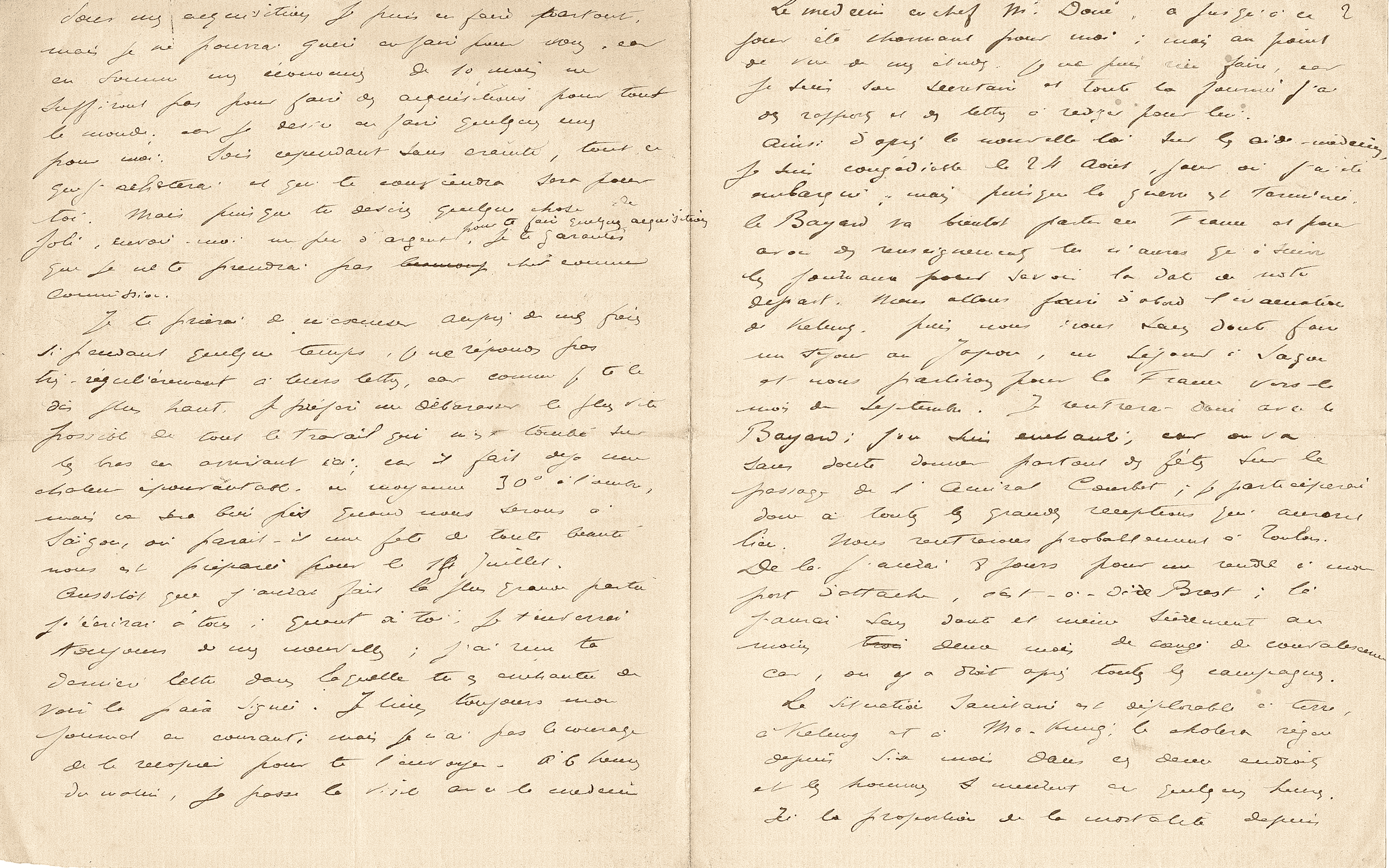 Le médecin en chef, M. Doué, a jusqu’à ce jour été charmant pour moi ; mais au point de vue de mes études, je ne puis rien faire, car je suis son secrétaire et toute la journée j’ai des rapports et des lettres à rédiger pour lui. Ainsi, d’après la nouvelle loi sur les aide-médecins, je suis congédiable le 24 août, jour où j’ai été embarqué ; mais puisque la guerre est terminée, le Bayard va bientôt partir en France, et pour avoir des renseignements, tu n’auras qu’à suivre les journaux pour savoir la date de notre départ. Nous allons faire d’abord l’évacuation de Kélung, puis nous irons sans doute faire un séjour au Japon, un séjour à Saïgon et nous partirons pour la France vers le mois de septembre. Je rentrerai donc avec le Bayard ; j’en suis enchanté, car on va sans doute donner partout des fêtes sur le passage de l’amiral Courbet ; je participerai donc à toutes les grandes réceptions qui auront lieu. Nous rentrerons probablement à Toulon. De là, j’aurai 8 jours pour me rendre à mon port d’attache, c’est-à-dire Brest ; là, j’aurai sans doute, et même sûrement, au moins deux mois de congé de convalescence, car on y a droit après toutes les campagnes.