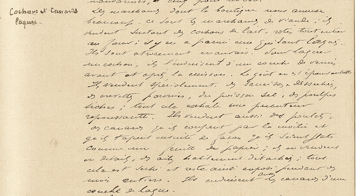 Les marchands dont la boutique nous amuse beaucoup, ce sont les marchands de viande ; ils vendent surtout des cochons de lait, rôtis tout entier au four ; il y en a parmi eux qui sont laqués. Ils sont atrocement mauvais. Pour laquer un cochon, ils l’enduisent d’une couche de vernis avant et après la cuisson139. Le goût en est épouvantable. Ils vendent spécialement des saucisses desséchées, des crevettes pourries, du poisson sec, des poulpes sèches [secs], tout cela exhale une puanteur repoussante. Ils vendent aussi des poulets, des canards, qu’ils coupent par la moitié et qu’ils tapent ensuite de façon qu’ils soient plats comme une feuille de papier ; ils en [m.s] vendent en détail des ailes habilement dé- tachées, tout cela est séché et reste ainsi exposé pendant des mois entiers. Ils enduisent aussi les canards d’une couche de laque.